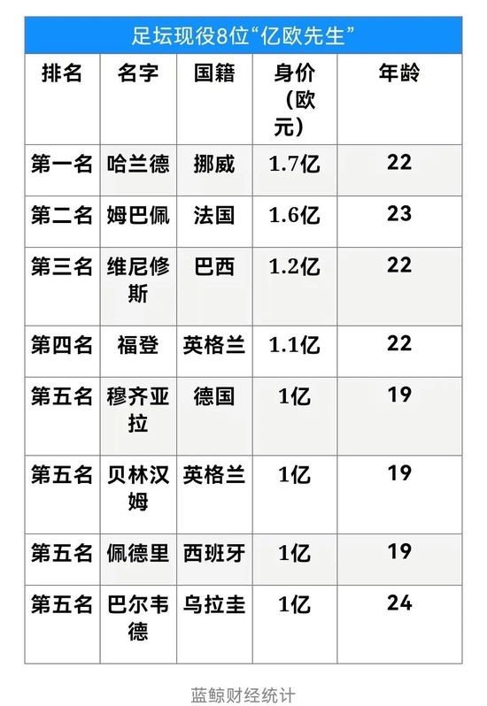 那些在绿荫场上厮杀球员,背地里早已被明码标价,对于一个职业球员来说,影响力往往与商业价值成正比,梅西也不例外。2018年是梅西身价最高峰,彼时身价为1.8亿欧元效力巴塞罗那俱乐部。2022年梅西的身价是5000万欧元,也是因为年纪偏大,身价比巅峰期跌去许多。数据显示,当今足坛身价最高的是“挪威魔人”哈兰德,高达1.7亿欧元,法国国脚姆巴佩以1.6以欧的身价排在第二位。