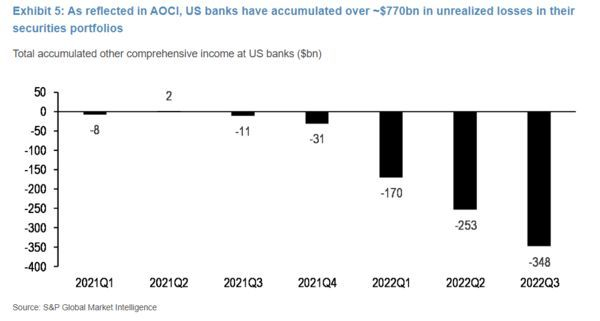 该行还表示:“还有另一个看似合理的理论。今年美联储激进的紧缩政策给银行的证券投资组合造成了巨大损失。正如AOCI(累计其他综合收益)所反映的那样,美国银行今年在AFS投资组合中的债券市值累计损失约7700亿美元,这大大减少了银行的权益,甚至在某些情况下已经减少到有形的普通股权益下降到负数的水平,这种情况在小银行中尤为明显。根据标普的数据,我们发现,截至第三季度,约30家银行(其中大多数总资产低于10亿美元)报告的有形普通股权益为负,高于22年第二季度的11家银行和22年第一季度的0家银行。”