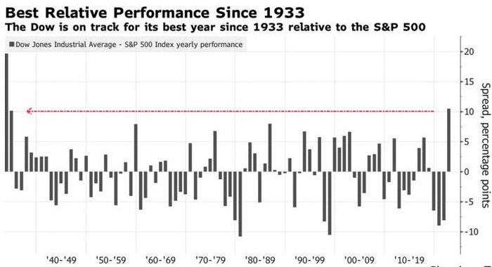 在大多数年份,道琼斯工业股票平均价格指数下跌8.2%几乎不会引起投资者的庆祝。但是在2022年,媒体汇编的数据显示,该指数今年跑赢标普500指数的503个成份股10个百分点,是1933年以来的最大差距。