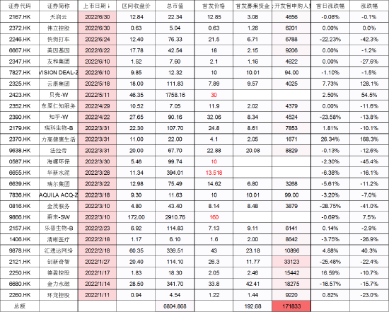 由于介绍上市新股没有发行价,我们以4只新股开盘价粗略计为公司发行价,以此算出,2022年上半年公司,港股只有6只新股未破发,其中1只股票无涨跌,破发率高达76.9%,上市首日破发率也超过50%。