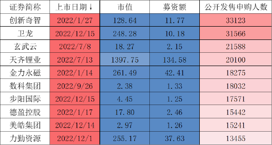 2022年港股新股公开发售共有508191名散户参与,而去年半年打新人数就突破1000万,打新参与度下滑严重。就今年打新人数来看,创新奇智、卫龙打新人数突破3万人,玄武云、天齐锂业打新人数突破2万人,心泰医疗打新人数更是不足千人。
