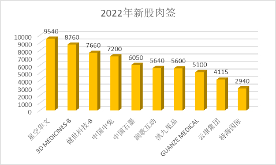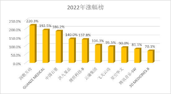 不计SPAC新股,介绍上市按定价计入发行价,2022年港股新股涨幅榜单中,润歌互动傍上体彩业务大涨逾220%,医学影像提供商Guanze Medical涨近200%,石墨烯概念中国石墨涨186%,水果上洪九果品暴涨140%,腾讯音乐也涨超80%。