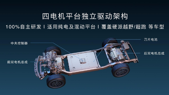四电机最高转速20500rpm,可输出1100匹马力,同时深度集成,首创带差速锁止功能,最高效率97.7%,可实现整车3秒级加速能力,电机可独立控制轮端扭矩的大小、方向,从而实现原地坦克掉头等燃油车无法实现的全新功能。