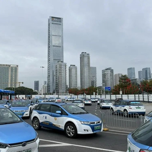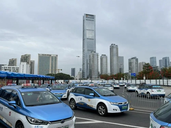 (深圳湾口岸排队等客的出租车 财联社记者摄)