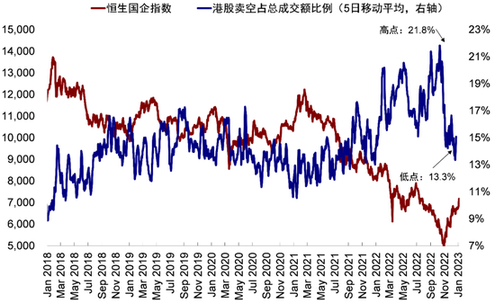 卖空回补:卖空成交与空头头寸均快速回落。港股卖空成交占总成交额比例自2022年7月以来持续攀升,并于10月上旬创下24.5%的高点,不过11月快速反弹后显著回落。从5日移动平均数据看,这一指标从10月高点降至12月下旬13.3%的低点。不仅如此,香港证监会(SFC)统计的淡仓(空头)存量头寸也同样减少。截至12月23日有空头仓位港股为651只,空头仓位占流通市值加总比重为1.33%,低于11月初的1.44%。