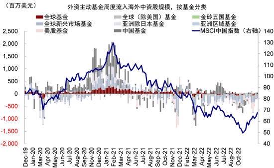 海外资金:主动基金流出放缓但尚未逆转。相比南向资金的持续流入,海外资金就要弱的多。海外主动资金的流出态势基本贯穿2022年全年,尤其是2022年3月、5月和8月之后“三重压力”明显升级期间。尽管EPFR口径下的被动资金全年维持流入,但与市场完全背道而驰的走势说明其走向很难作为判断依据,因此我们在分析中主要以主动资金作为对象(谁在卖出?从资金面看近期港股波动港股流动性与持股情况分析)(口径上,EPFR海外资金主要涵盖海外“基金”类型的投资者,但并不包含例如对冲基金、海外养老金与主权基金等其他类型机构)。