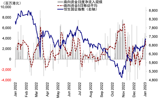 不过积极的是,2022年底尤其是2023年开年以来,南向资金明显回暖。过去7个交易日日均流入回升至34.4亿港元。往前看,我们预计南向资金有望重拾流入势头,并在海外资金明显回流前继续成为港股资金面主力。2022年全年南向资金逆势流入3862.8亿港元(vs. 2021年的4544.0亿港元以及2020年的6721.3亿港元)。我们预计随着市场情绪的重新回暖,叠加国内货币政策立场持续宽松,南向资金2023年有望持续青睐港股市场。