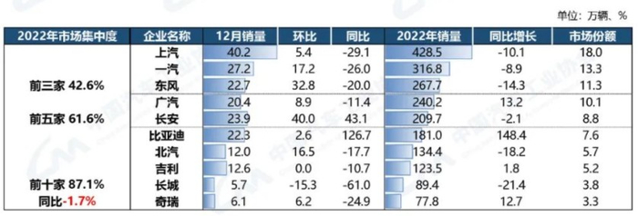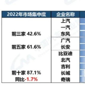 重点企业方面,2022年,汽车销量排名前十位的企业集团销量合计为2314.8万辆,同比增长2.3%,占汽车销售总量的86.2%,高于上年0.2个百分点,在汽车销量排名前十位企业中,与上年相比,比亚迪(002594.SZ)在新能源市场的持续走强,销量增速最为明显。广汽、奇瑞呈两位数快速增长,长安(000625.SZ)、吉利(00175)呈个位数增长其他企业则呈不同程度下降。