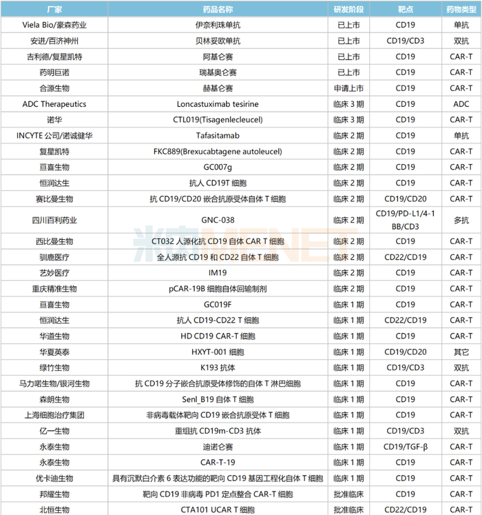 目前全球已有10款CD19靶向药物上市,涉及单抗、双抗、CAR-T、ADC四大技术路线。