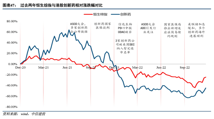 多重压制因素缓解,创新药产业迎来春天2023年创新药的行业环境有望逐步触底回升。21年7月以来,创新药显著跑输恒生综指。主要原因我们认为有以下几点:1)美联储加息导致全球风险资产估值下行,以DCF估值为基础的创新药资产敏感性更高;2)创新药定价不及预期,导致销售不及预期,进而影响峰值销售预测;3)行业内部竞争激烈,企业盈利困难,经营压力较大;4)创新药出海遇到阶段性困难。而以上问题在22H2逐步缓解,加息预期反应相对充分,医保谈判更加科学化市场化,伴随行业出清竞争减少,出海迎来新的曙光。因此展望2023年,我们对行业环境进一步改善保持乐观。
