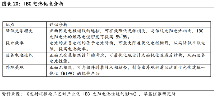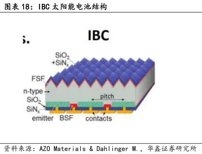 IBC(interdigitated back contact,全背电极接触晶硅光伏电池)的正负极电池以叉指状的方式排列在电池背光面,p-n结也位于电池背面,属于背接触太阳电池。正面没有金属电极遮挡使IBC电池具有更高的短路电流Jsc,同时背面可以容许较宽的金属栅线来降低串联电阻Rs从而提高填充因子FF;加上电池前表面场以及良好钝化作用带来的开路电压增益,IBC电池在降低光学损失、提升效率、改善电池性能,外观美观等多个方面具备优势。