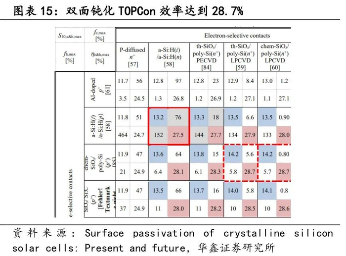 隧穿氧化层钝化接触太阳能电池(Tunnel Oxide Passivated Contact solar cell,TOPCon)是2013年德国Fraunhofer太阳能研究所首次提出的一种新型钝化接触太阳能电池。其电池结构为N型硅衬底电池,在电池背面制备一层超薄氧化硅,然后再沉积一层掺杂硅薄层,二者共同形成了钝化接触结构,有效降低表面复合和金属接触复合。根据ISFH测算,双面多晶硅钝化TOPCon电池的理论最高效率达28.7%,且最接近晶体硅太阳能电池理论极限效率29.43%,提效潜力大。