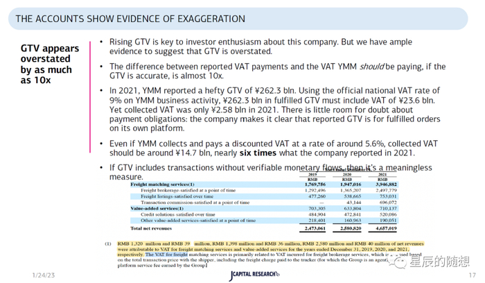其次,J Capital有一个认为可以交叉验证满帮交易量虚增的观点是公司GTV金额和交的VAT(增值税)金额严重不匹配,实际上是因为作为外资做空机构对公司的业务尤其是满运宝业务理解错误导致的。