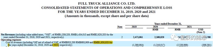 实际上,在满帮平台上成交的订单大多数货主是不要求开票的,2021年只有17%的GTV部分是货主要求开票的,满帮开票的平台是满运宝,只有货主要求开票了满帮才会代货主缴纳增值税。另外,满帮满运宝平台由于享受国家增值税优惠,虽然交了9%的增值税,政府会返还一半,因此实际交的增值税只有4.5%(满运宝向货主收取的开票服务费大概6%,因此会赚1.5%,这也是满运宝的盈利模式。)因此2021年缴纳的增值税的正确计算方法是GTV*满运宝渗透率(货主在满帮平台开票渗透率)*实际增值税率(9%-国家税返)=2623*17%*4.5%=20亿,和公司财报体现的是一致的。
