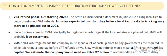 报告中提到了公司前员工和专家认为政府对于满运宝业务增值税税返优惠政策在2023和2024年会逐步减少直至取消,从而会对公司业绩造成不少影响。