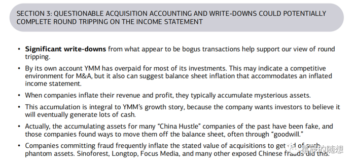 报告中提出公司在最近几年有很大的减值计提损失,其中不少是由于收购的公司经营不善做了减值计提导致,这也有可能导致公司收入的虚增。