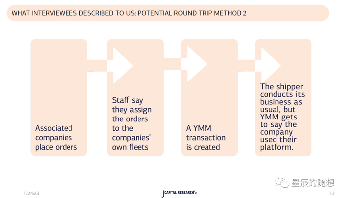 首先,J Capital这篇做空报告最核心的观点怀疑满帮平台的交易量虚增了6-10倍,也就是刷单。J Capital称通过采访一些满帮的前员工得知,满帮有通过几种方式刷单,1、成立一些壳公司冒充发货公司发布虚假货运订单,然后销售人员找到一些假司机接订单,销售人员从合作银行借钱给假司机付掉运费,假司机把钱还给销售人员返还银行贷款,同时备注只要借款一周内归还不需要付利息。2、公司找一些熟悉的自己有运输车队的发货公司帮忙,虽然其实是用自己公司的车队运输,但是假装在满帮的平台上走一下流程。