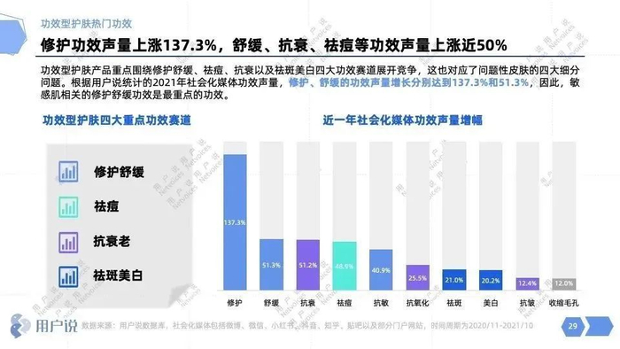 据《中国功效型护肤行业2022发展趋势报告》数据统计:2021年社会化媒体护肤功效声量增幅中,修护和舒缓的声量增长分别达到137.3%和51.3%,位列TOP2。