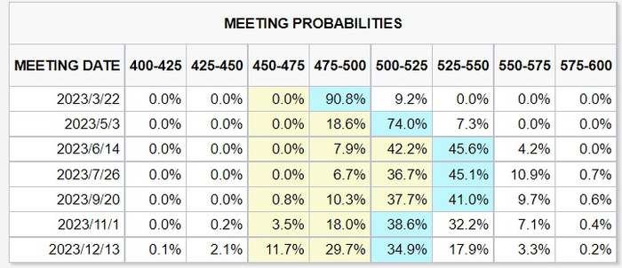 期货合约定价显示,交易员押注美联储将在3月和5月的议息会议上将再各加息25个基点,并预计在6月或7月进一步加息的可能性大致相同,目前的水平为4.5%-4.75%。