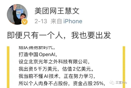 为了表达自己的决心,王慧文在微博上宣布创业这一消息时还特意加上了一句话,“即便只有一个人,我也要出发”。