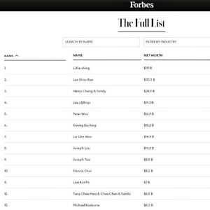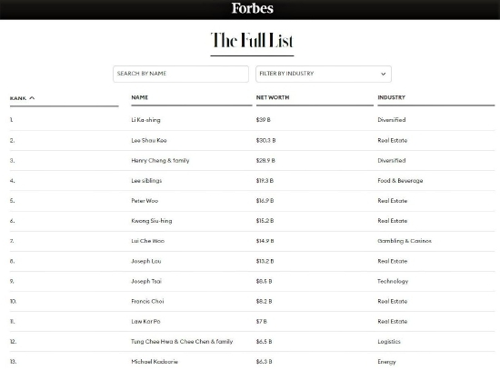 福布斯发布2023香港富豪榜,李嘉诚财富390亿美元登顶,汤晓鸥身家缩水60%