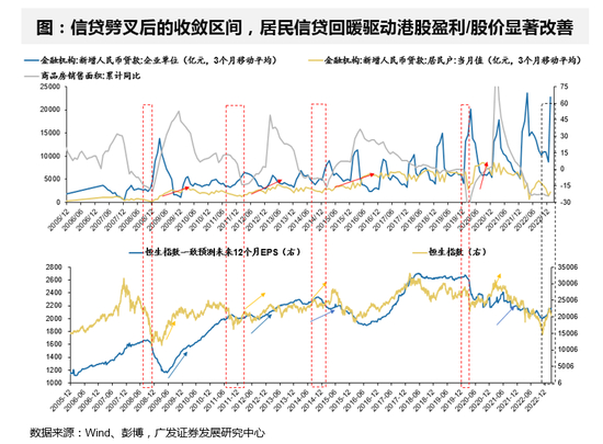 第二个视角是信贷劈叉后的收敛。历史经验是,“企业信贷强、居民信贷弱”组合后不久,居民信贷迎来连续改善,港股盈利/股价走好,如08/12、12/02、15/02、20/02。