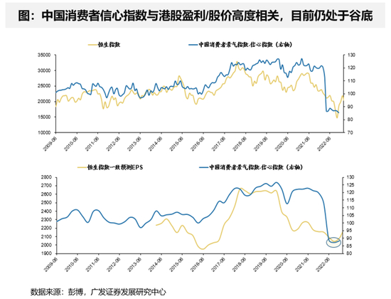 第一个视角是消费者信心。中国消费者信心指数与港股盈利/股价存在高度显著的相关性,目前仍处于谷底,也对应着港股目前盈利仍处于谷底位置,后续低位回升确定性高。那么消费者信心改善的驱动是什么?我们认为是就业,我们看到22年2季度中国消费者信心指数大幅下挫,当时也对应着上海疫情冲击失业率陡升的阶段,目前截止去年12月,城镇调查失业率为5.5%,后续改善将驱动消费者信心指数回升。