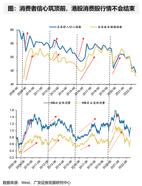 我们认为消费行情并非昙花一现。中短期,消费的基本面的修复也比较长,分三步走:“有地方花—>敢花—>有钱花”。首先当前消费股行情聚焦在第一阶段“有地方花”,接下来是就业改善敢花钱、后续经济好转有钱花,所以基本面改善比较持续,行情层面,复盘09年以来历次港股的反转行情,居民就业预期和收入预期逐步抬升的阶段,港股必需消费和可选消费持续走高,除非居民就业/收入预期见顶,才能说行情结束。目前消费者信心还处于谷底,向上确定性很高。
