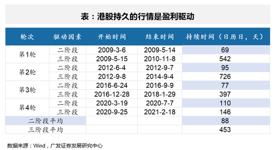 历史经验,港股持久的行情终由盈利驱动,历次底部反弹后的牛市二阶段“价值重估”行情平均持续2-3月,而三阶段盈利驱动行情持续一年以上,行情驱动从估值转向盈利。