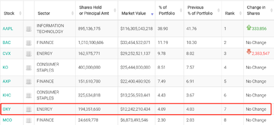 除此以外,伯克希尔还持有西方石油10万股的优先股,以及8385.88万股购买普通股的认股权证。