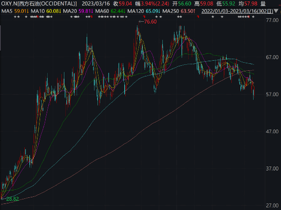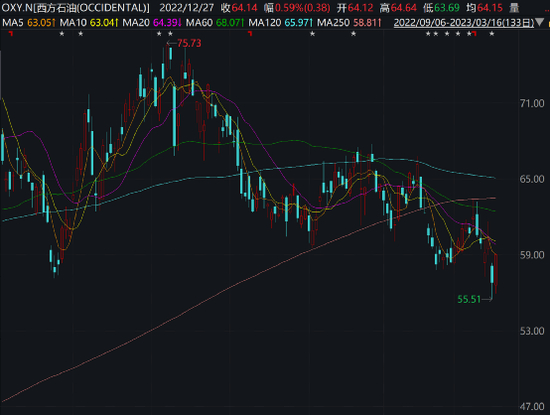 从股价表现来看,西方石油自去年11月以来,从每股75.73美元附近一路震荡下跌至今年3月15日的最低点每股55.51美元,区间调整幅度非常大。