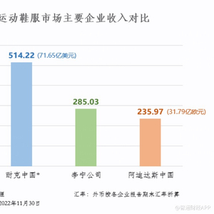 以上数据表明,安踏体育的年度业绩显著跑赢了大盘,凸显出逆势高质量增长的含金量。不仅如此,安踏在与主要竞争对手的较量中,也占据主动且巩固竞争优势。据各企业业绩公告,2022年,安踏集团实现营收突破536.51亿元,对比耐克中国截至2022年11月30日12个月的营收数据,安踏体育已完成对后者的超越,两者在中国市场同处第一阵营。横向对比来看,安踏对第二梯队的李宁和阿迪达斯中国也保持绝对领先优势。