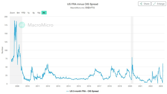 VIX恐慌指数持续上行至2022年10月以来高点,黄金价格大幅攀升并在周一一度突破2000美元/盎司,美债收益率(尤其是基准十年期美债收益率)持续走低,这些都反映出市场避险情绪浓厚。与此同时,FRA-OIS利差扩大至2012年以来高点(不考虑新冠疫情初期),这一体现银行间市场融资紧张状况以及货币市场风险的最重要指标之一的再次飙升则表明流动性的紧张。
