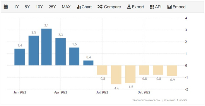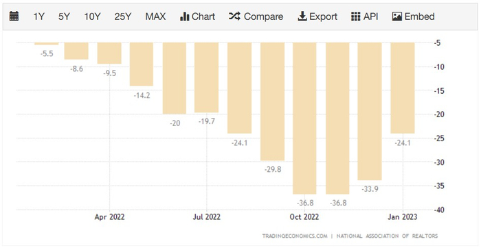 高企的房贷利率挤压人们的负担能力,将购房者拒之门外。美国全国房地产经纪人协会(NAR)公布的数据显示,1月成屋签约销售指数(Pending Home Sales Index)同比下跌24.1%。美国成屋销售占住房销售量的约九成,该指标可视为成屋销售的领先指标,用来衡量美国整体房屋销售的状况。此外,最新数据显示,12月标普凯斯席勒(S&P/CS)全美房价指数连续第六个月下滑,环比下跌0.9%;同比上涨4.6%,但创下2020年7月以来的最低同比涨幅。