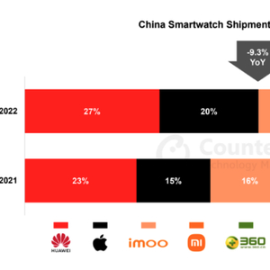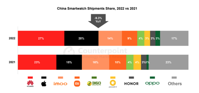 Counterpoint Research:2022年中国智能手表出货量同比下降8.8% 华为、苹果共占近50%份额
