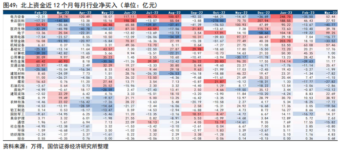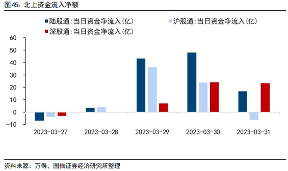 近五个交易日北上资金合计净流入104.65亿元,其中沪股通净流入53.92亿元,深股通净流入50.73亿元。从单日情况看,近五个交易日最大单日净流入48.07亿元,仅3月27日单日净流出6.94亿元。截至2023年3月31日,近一个月内北上资金累计净流入341.36亿元。