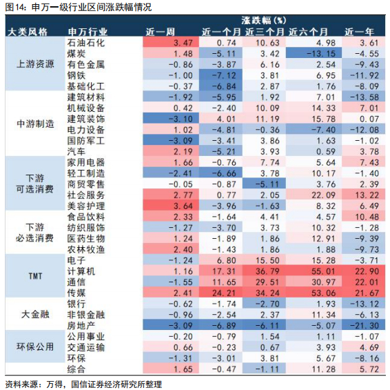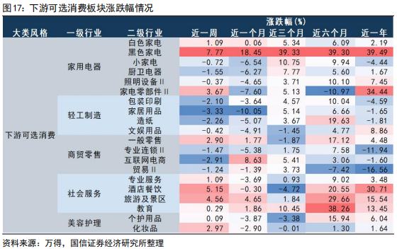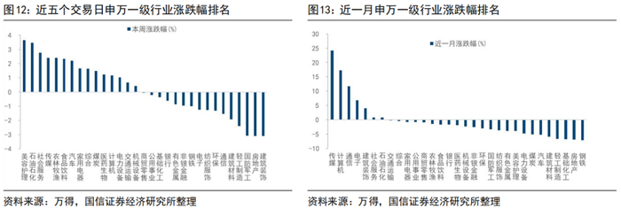 近五个交易日美容护理、石油石化、社会服务涨幅较大,建筑装饰、房地产、国防军工调整幅度较大。近五个交易日涨幅较大的五个行业为美容护理(3.64%)、石油石化(3.47%)、社会服务(2.77%)、传媒(2.41%)、农林牧渔(2.40%);调整幅度较大的行业有建筑装饰(-3.10%)、房地产(-3.09%)、国防军工(-3.09%)、轻工制造(-2.41%)、建筑材料(-1.92%)。
