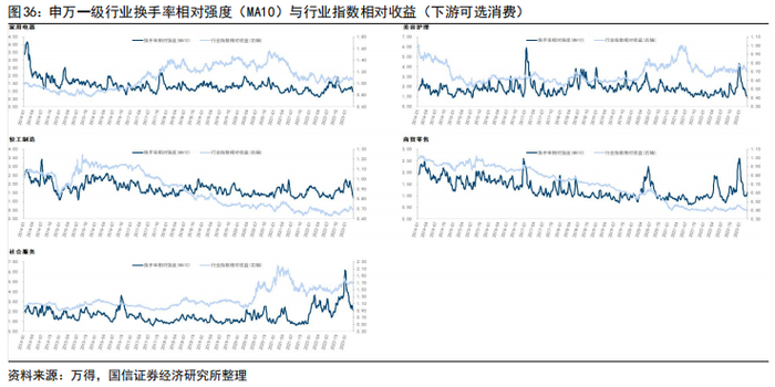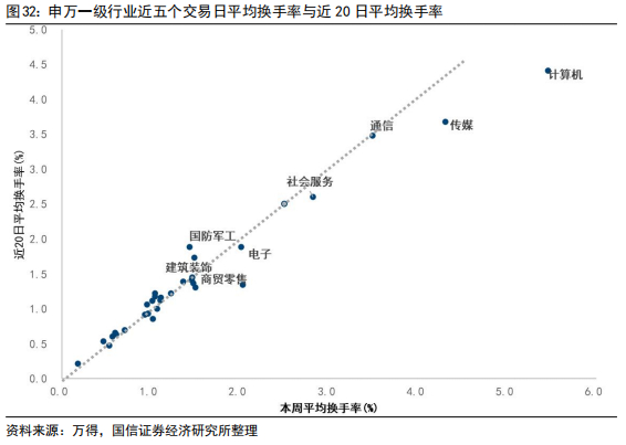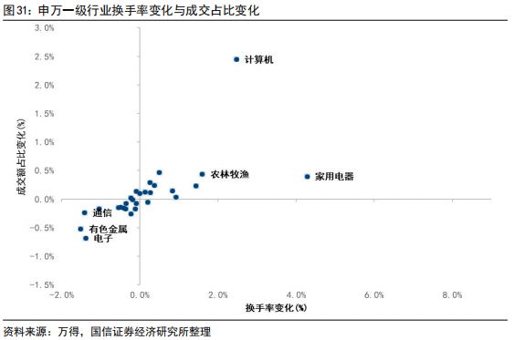 各行业成交结构出现分化,计算机、家电、农业热度上升较多。从行业换手率与成交结构的边际变化情况看,近五个交易日内,交易热度上升较多的行业为计算机、家电、农林牧渔;热度下降较多的行业为电子、通信、有色。