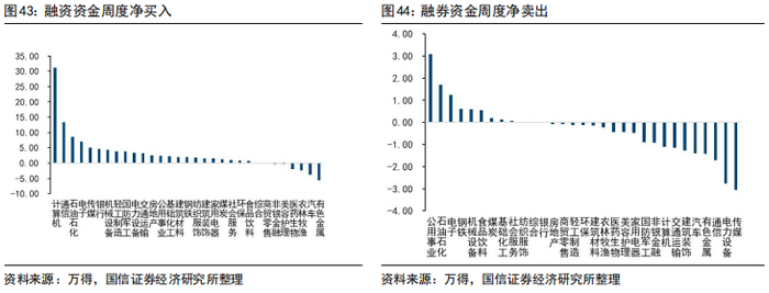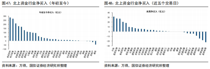 行业层面,本周净流入前五的行业依次为汽车、医药生物、电子、食品饮料、传媒,净流入分别为31.43、27.70、27.20、20.55、18.29亿元;净流出前五的行业依次为家电、非银、银行、建材、商贸零售,净流出分别为22.23亿、17.84亿、14.33亿、8.54亿和4.20亿。
