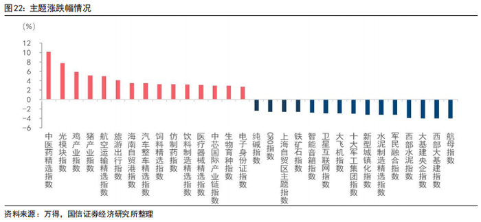 主题赛道涨跌分化较大,中药、光模块、鸡、猪领涨。主题&赛道方面,涨幅前五为中药(10.17 %)、光模块(7.74%)、鸡(5.87 %)、猪(5.11%)、航空运输(4.98%);下跌前五主题有航母(-4.04%)、西部大基建(-4.01%)、大基建央企(-3.98%)、西部水泥(-3.90%)、军民融合(-3.25%)。