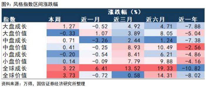 风格层面,近五个交易日成长价值相对均衡。大盘价值、中盘价值、小盘价值分别下跌0.33%、上涨0.41%、上涨0.14%;大盘成长、中盘成长、小盘成长分别上涨1.27%、上涨0.71%、下跌0.20%;全球成长、全球价值分别上涨3.22%、上涨3.73%。