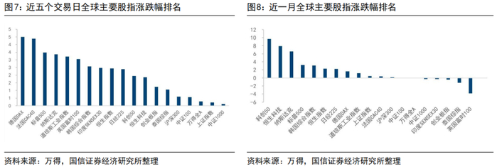 近五个交易日(3月27日-3月31日),国内、海外股指均上涨。海外主要指数均上涨,涨幅前三的指数为德国DAX(4.49%)、法国CAC40(4.38%)、SPX 500(3.48%)。A股指数均收涨,上证指数上涨0.22%,万得全A上涨0.27%,沪深300上涨0.59%,中证100上涨0.57%,中证1000上涨0.11%,创业板指上涨1.23%,科创50上涨1.94%。