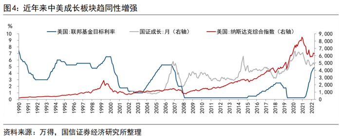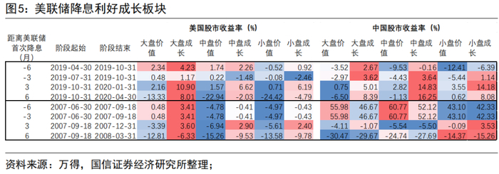 二是缓解股票估值压力,尤其是科技股、成长股板块。相对于价值股,投资者更加注重成长股未来的盈利潜力而非当前的盈利水平,因为它们可能会投入大量资本用于扩张和发展,从而在未来实现更高的现金流,仅考虑当前的财务指标很难完全反映出其价值。因此成长股的估值往往使用现金流折现模型,而美联储降息能够降低美股估值模型中的贴现率,直接导致美国成长股估值上调,对A股科技股、成长股的估值提升则形成催化作用。