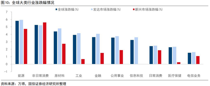 近五个交易日发达、新兴市场各行业悉数上涨。全球市场中,能源、非日常消费、原材料涨幅较大,日常消费、医疗保健、电新业务涨幅较小;发达市场能源、非日常消费、原材料涨幅较大,分别上涨5.93%、5.20%、4.78%,仅电信业务涨幅不足2%;新兴市场除信息科技下跌0.01%外各行业均收涨,非日常消费、能源、原材料分别上涨5.59%、4.72%、2.73%。