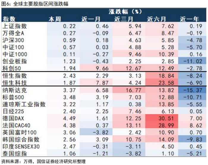 行情概况:国内海外股指均上涨,美护、石化、社服涨幅较大。海外指数涨幅前三为德国DAX、法国CAC40、SPX 500。A 股主要宽基指数悉数上涨,创业板指、科创50涨幅较大,分别上涨1.23%、1.94%。行业方面,美容护理、石油石化、社会服务分别上涨3.64%、3.47%、2.77%。
