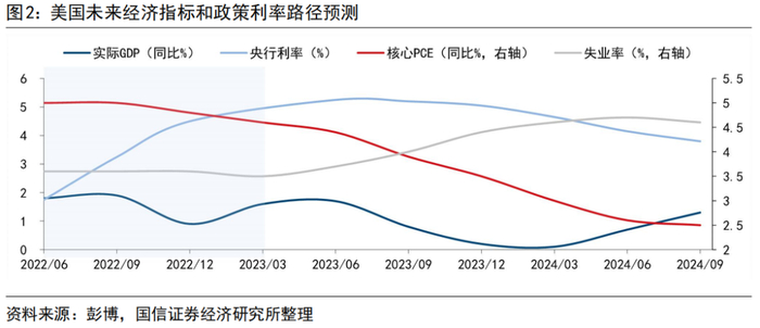 美国联邦存款保险公司接管硅谷银行后,一定程度上提振了市场信心,但对美联储原有的加息节奏仍有加压。随着通胀率逐渐回归2%的目标,控制经济衰退风险和金融系统性风险的重要性上升,美联储将转向宽松的货币政策。我们预测,美国GDP增速将于下半年开始出现显著回落,同时伴随失业率高企,预计美联储于2023年年中暂停加息,三季度将开始降低联邦基金利率。