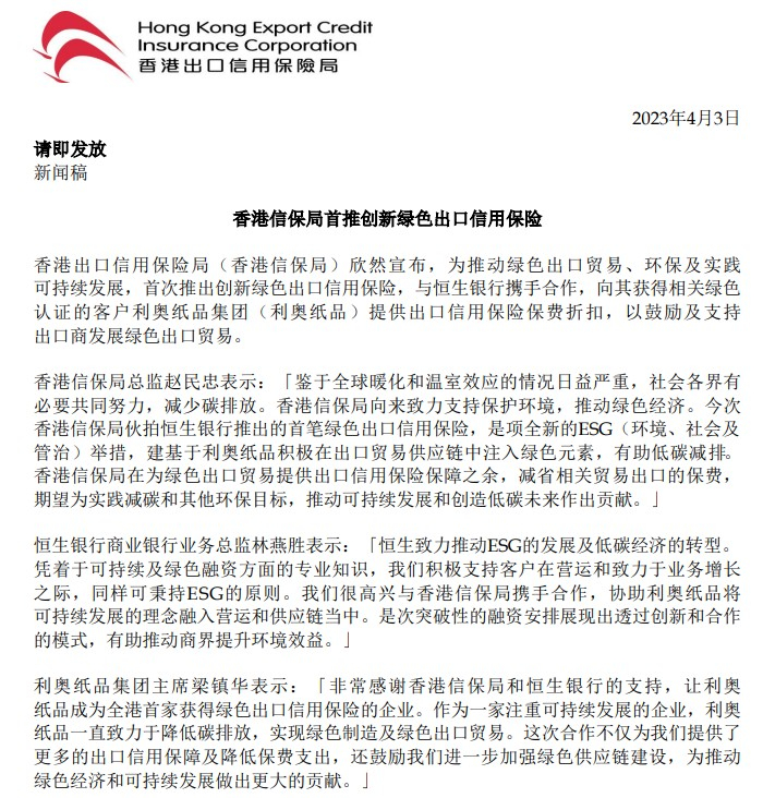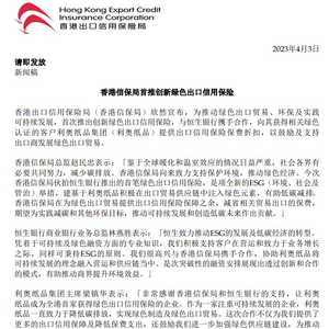 4月3日,香港信保局宣布,首次推出创新绿色出口信用保险,与恒生银行(00011)携手合作,向其获得相关绿色认证的客户利奥纸品集团提供出口信用保险保费折扣,以鼓励及支持出口商发展绿色出口贸易。香港信保局总监赵民忠表示,今次信保局伙拍恒生银行推出的首笔绿色出口信用保险,是项全新的ESG举措,建基于利奥纸品积极在出口贸易供应链中注入绿色元素,有助低碳减排。