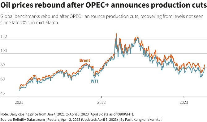 据悉,俄罗斯副总理亚历山大·诺瓦克表示,西方银行业危机是减产背后的原因之一,也是“干扰能源市场动态”的原因之一。过去一个月,对新一轮银行危机的担忧导致投资者抛售大宗商品等风险资产,油价自2022年3月的139美元历史高点附近跌至每桶70美元附近。
