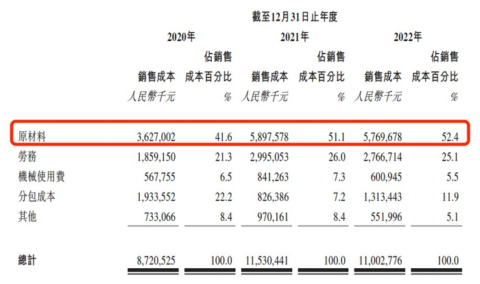 报告期内,山西安装的销售成本也是“水涨船高”,分别达到了87.21亿元、115.3亿元、110.03亿元。拆解来看,近几年来山西安装的原材料成本稳步上升,报告期内原材料成本占销售成本的比重分别达到了41.6%、51.1%、52.4%。