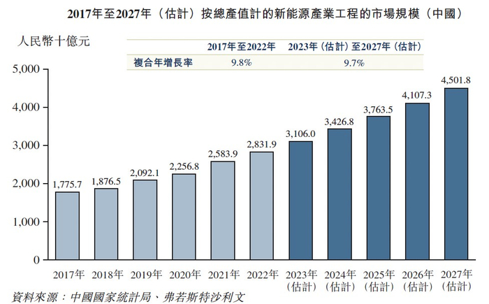 根据机构预测,2023-2027年,中国专业工业工程总产值预计将以8%的复合年增长率持续增长。其中,细分行业中国新能源产业工程的市场规模预计将从2022年的28319亿元扩容至2027年的45018亿元,期间复合年增长率约为9.7%。